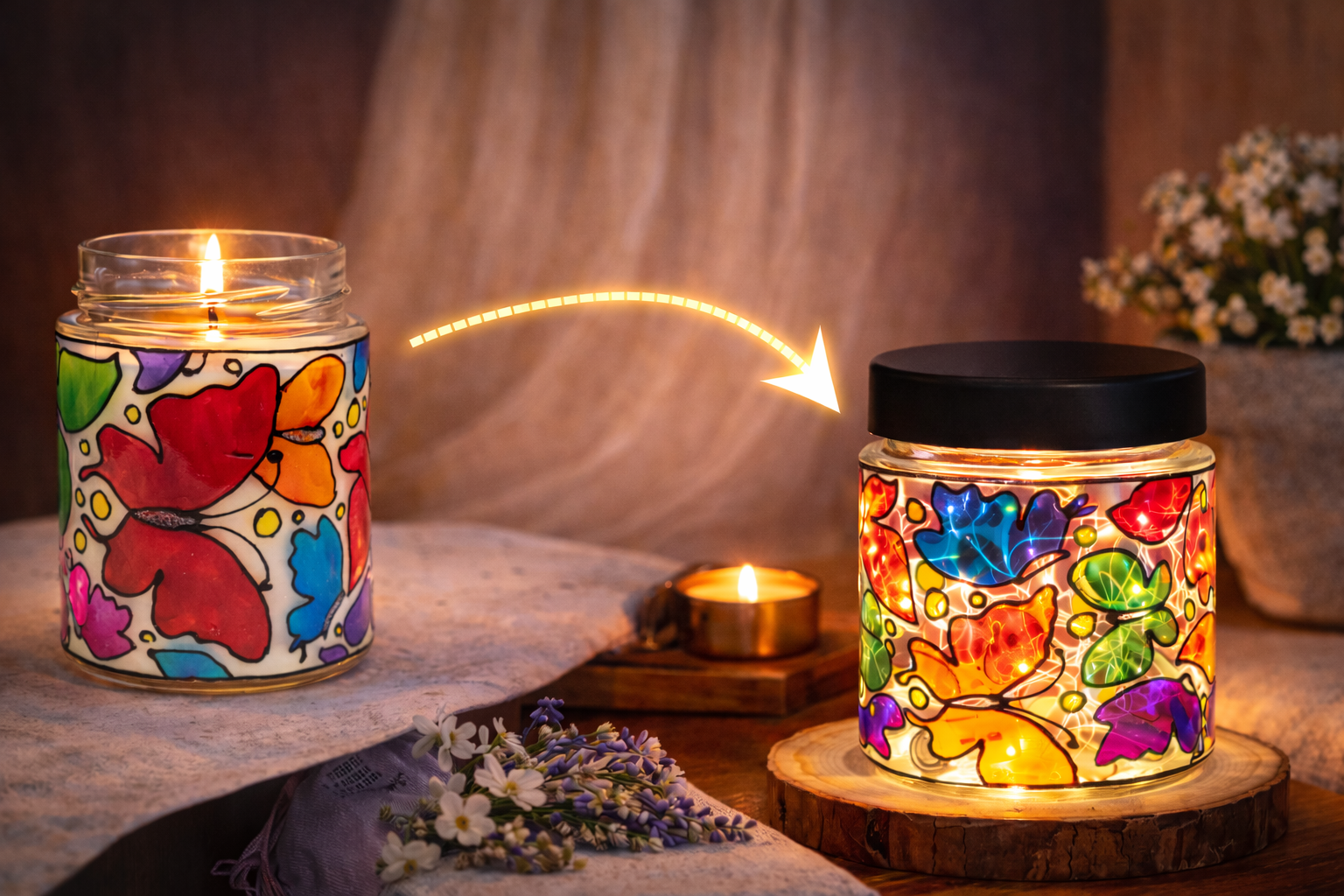 Când lumânarea este aprinsă, lumina trece prin culori exact ca printr-un vitraliu, iar borcanul nu mai este doar un recipient — devine o lampă caldă, vie, care schimbă atmosfera încăperii.