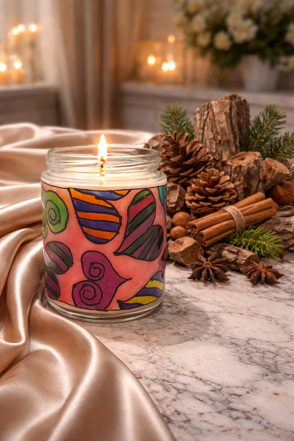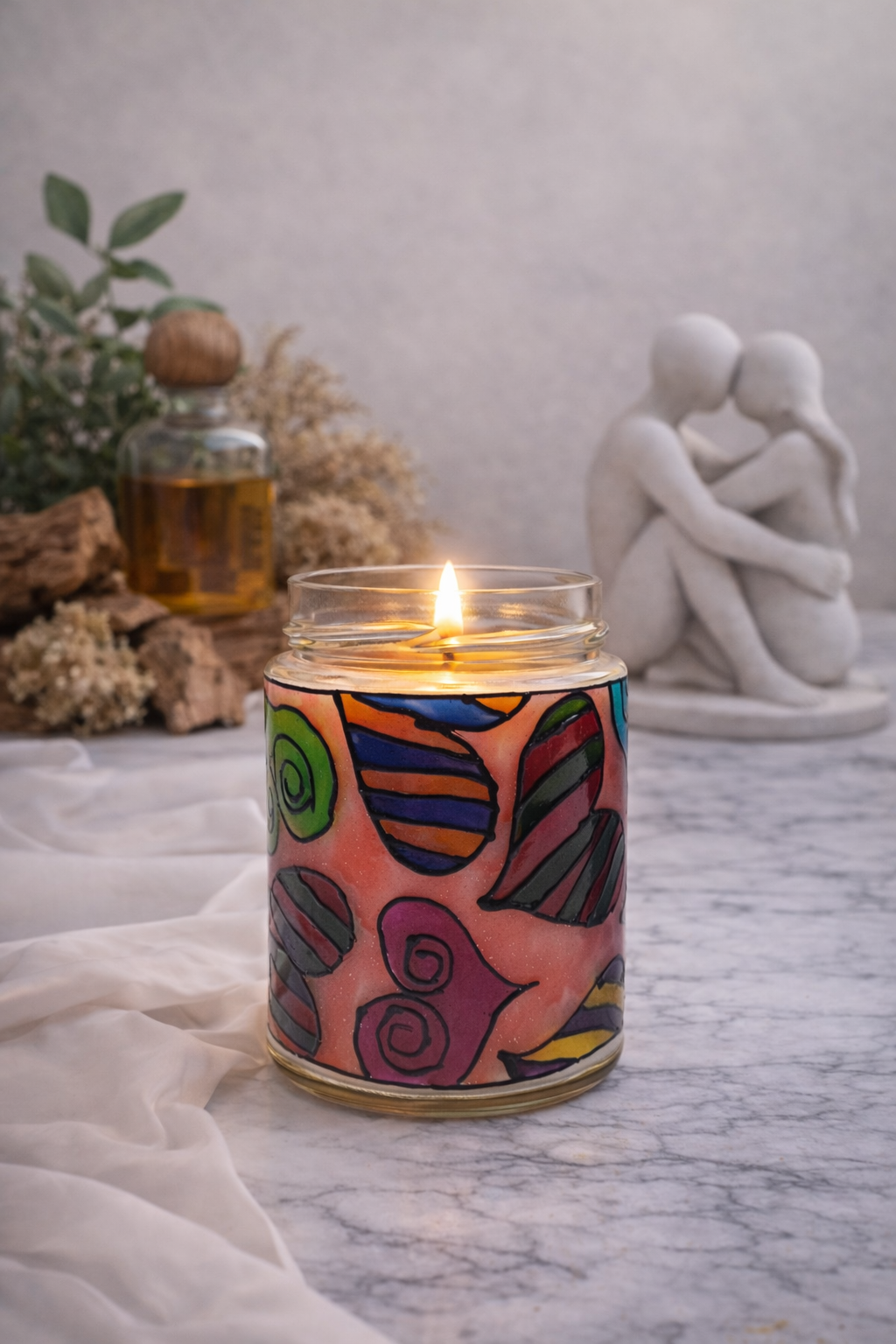 Acest borcan special, pictat manual, adăpostește ceară de soia intens parfumată, iar după ce lumânarea se consumă, se transformă într-o delicată lumină de veghe ce îmbracă încăperea într-o lumină colorată, caldă și relaxantă. Nu este doar o lumânare — este o experiență care continuă.