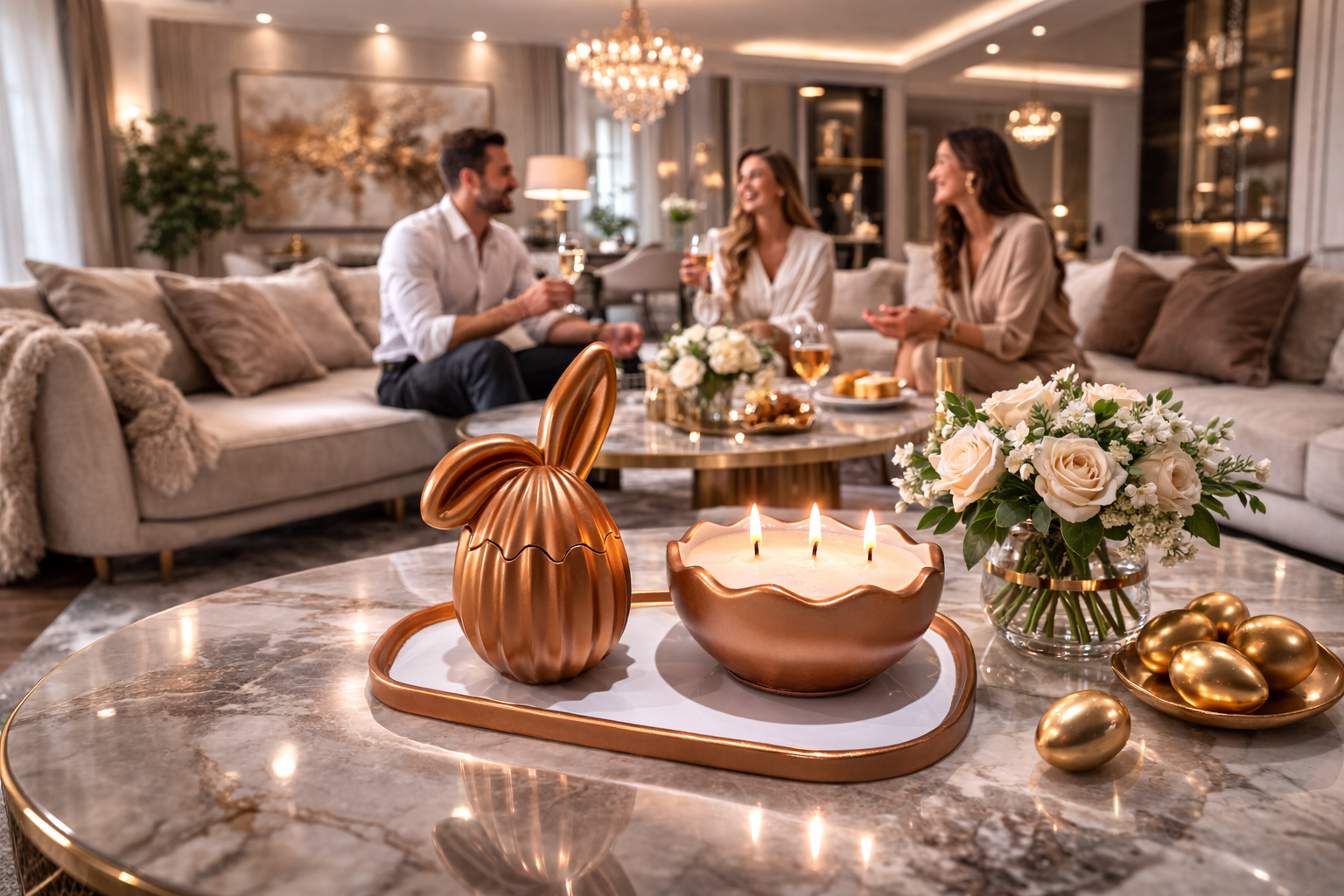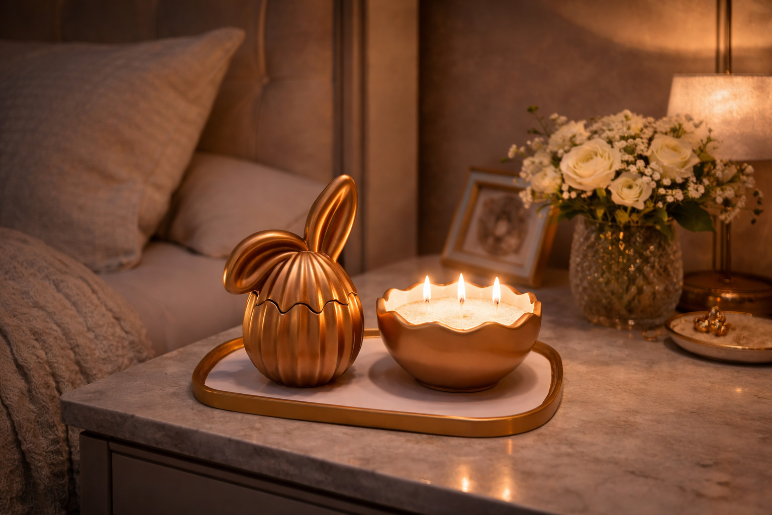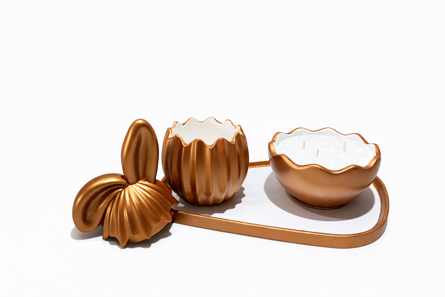 Piesa centrală a colecției este cutia decorativă în formă de ou cu urechi de iepuraș, un obiect de design care îmbină perfect estetica și funcționalitatea. Finisajul metalic elegant și liniile armonioase îi conferă un aer rafinat, transformând-o într-un accent decorativ care atrage privirea.
